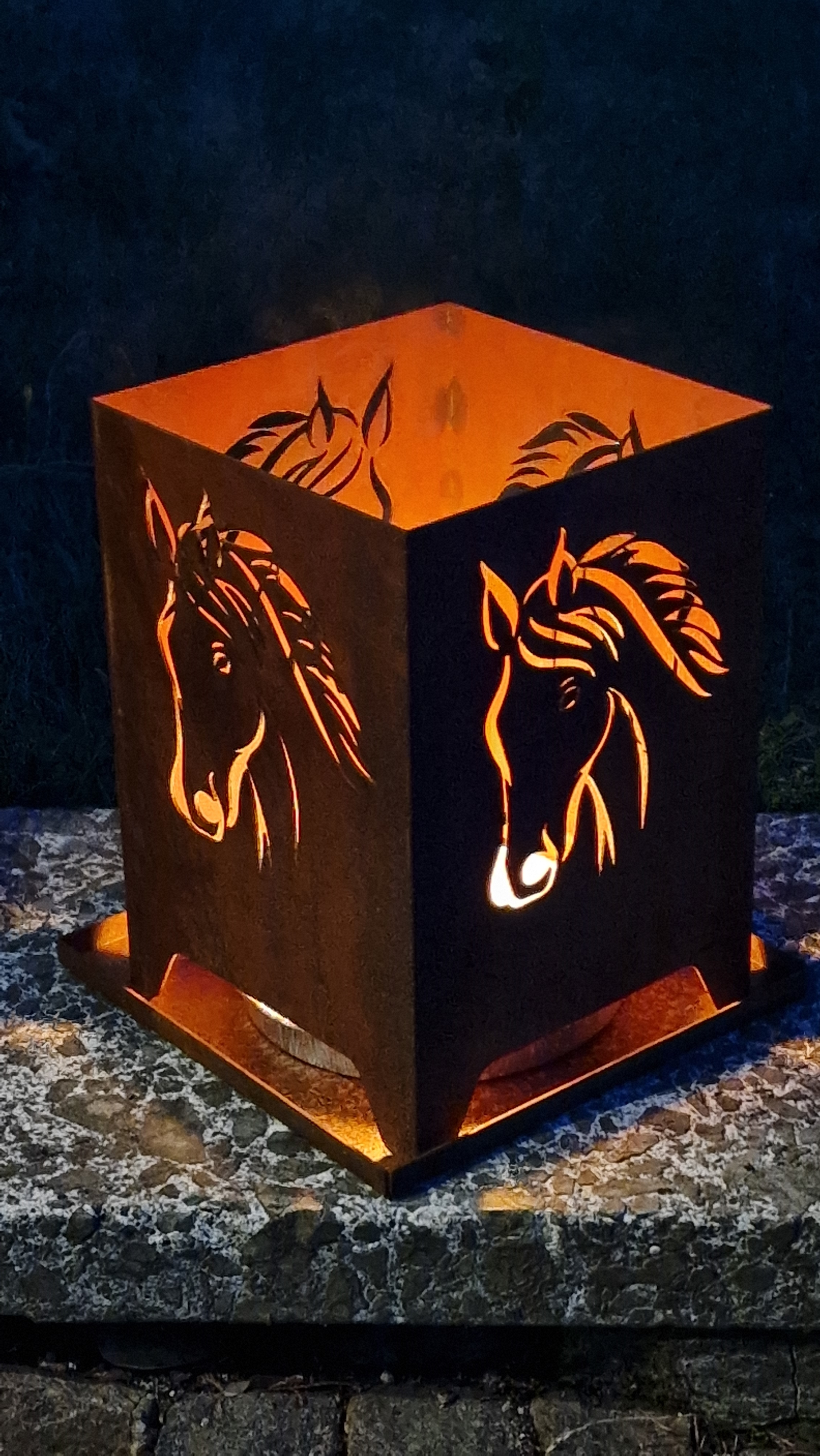 Feuerkorb Pferd <br> Schöner Feuerkorb mit 4-seitigem Pferdekopf<br><br> Mit diesem stillvollen Feuerkorb können Sie die ruhige Ausstrahlung der Pferde in Kombination mit dem knistern und der tollen Wärme eines Feuers geniessen und dem Altag ein wenig entfliehen.<br><br> Das Motiv ist auf allen vier Seiten zu sehen.<br> Bei dem Feuerkorb sind alle 4 Seiten miteinander verschweißt. Dies stellt die hochwertigste Ausführung dar, dass ein Verziehen des Korbes nahezu ausgeschlossen wird. Vor dem Gebrauch nur noch das Ascherost einlegen und in die Aschewanne stellen. Schon kann der Feuerspass beginnen. Maße: Breite: ca. 37 cm<br><br> Länge: ca. 37 cm<br><br> Höhe: wählen Sie oben Ihre gewünschte Höhe<br><br> Lieferumfang: Feuerkorb mit Ascherost und Ascheschale Informationen zum Material: Der Feuerkorb und das Ascherost sind aus 3mm Stahlblech hergestellt. Die Materialdicke von 3mm sorgt dafür, dass der Feuerkorb wesentlich stabiler und langlebiger im Vergleich zu vielen anderen dünnen Feuerkörben ist. Lediglich die Aschewanne ist aus 2mm Stahlblech hergestellt, da diese nur einer geringen Beanspruchungen unterliegt..<br> Der Feuerkorb wir ungerostet versendet. Im Laufe der Zeit entwickelt der Feuerkorb draußen eine schöne Rostpatina..<br> Ein kleiner Tipp => Sie können die Aschewanne auch als Deckel verwenden, sei es zum Abstellen einer Pflanzschale oder um aus Ihrem Feuerkorb ganz einfach einen Hocker zu machen..<br> Weiteres Zubehör: Möchten sie Ihren Feuerkorb auch noch anders nutzen, dann schauen Sie in unsere anderen Angebote. Hier haben wir noch ein wenig ergänzendes Zubehör wie z.B. eine Grillplatte oder einen Pflanzeinsatz für Sie im Angebot. Hiermit können Sie Ihren Feuerkorb vielfältig verwenden, auch in Zeiten wo Sie kein Feuer machen..<br>.<br> Im Zuge der Herstellung können an den Feuerkorb kleinere Kratzer und Schleifspuren entstehen. Zudem ist es auch möglich, dass bereits die Bildung der Patina- /Rostänsätze am Feuerkorb vorhanden sein können. Dies alles stellt bei einem solchen Produkte keinen Mangel dar und sind als normal anzusehen. Nach dem ersten Gebrauch und der Bildung der Rostpatina werden die allerersten Spuren nicht mehr sichtbar sein..<br>.<br> Wir stellen unsere Feuerkörbe ganz bewusst mit entnehmbarem Gitterrost und Aschewanne her. So ist eine schnelle Reinigung nach dem Gebrauch möglich. Entnehmen sie einfach das Gitterrost und die Asche und Holzkohle fallen einfach in die Aschewanne, in der der Feuerkorb steht. Heben Sie den Feuerkorb bei Seite und dann können Sie die Schale einfach ausleeren. So fällt am wenigsten der Asche und Holzkohle daneben..<br>.<br> Bitte beachten: Bei Befeuerung auf nicht brennbaren Untergründen aufstellen, da der Feuerkorb sehr heiß wird und Hitze übertragen kann..<br> Es ist permanent auf genügend Abstand zu brennbaren Objekten zu achten. Außerdem muss mit Funkenflug gerechnet werden..<br> Achten Sie stets zum Schutz von Kindern darauf, dass diese nicht unbeaufsichtigt an brennenden Feuerstellen sind. Füllen Sie keine heiße Asche in Mülleimer oder andere nicht feuerfeste Behälter.